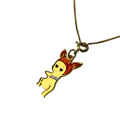 Ciondolo da ragazza o da Donna prodotto da Re Mida e realizzato artigianalmente dai nostri laboratori. Il pendente è fatto in lastra d'Argento 925 con Laminatura in Oro 18 KT, rappresente il pupazzetto più virale del momento, il Sonny Angels, un piccolo angelo con un simpatico cappello a forma di volpe, è arricchito da smalto arancione. La lunghezza di 3 cm. La chiusura è con gancio a molla per dare la possibiltà di agganciarlo dove si vuole, vicino ad una collana o anche ad un bracciale oppure vicino ad un portachiavi.
