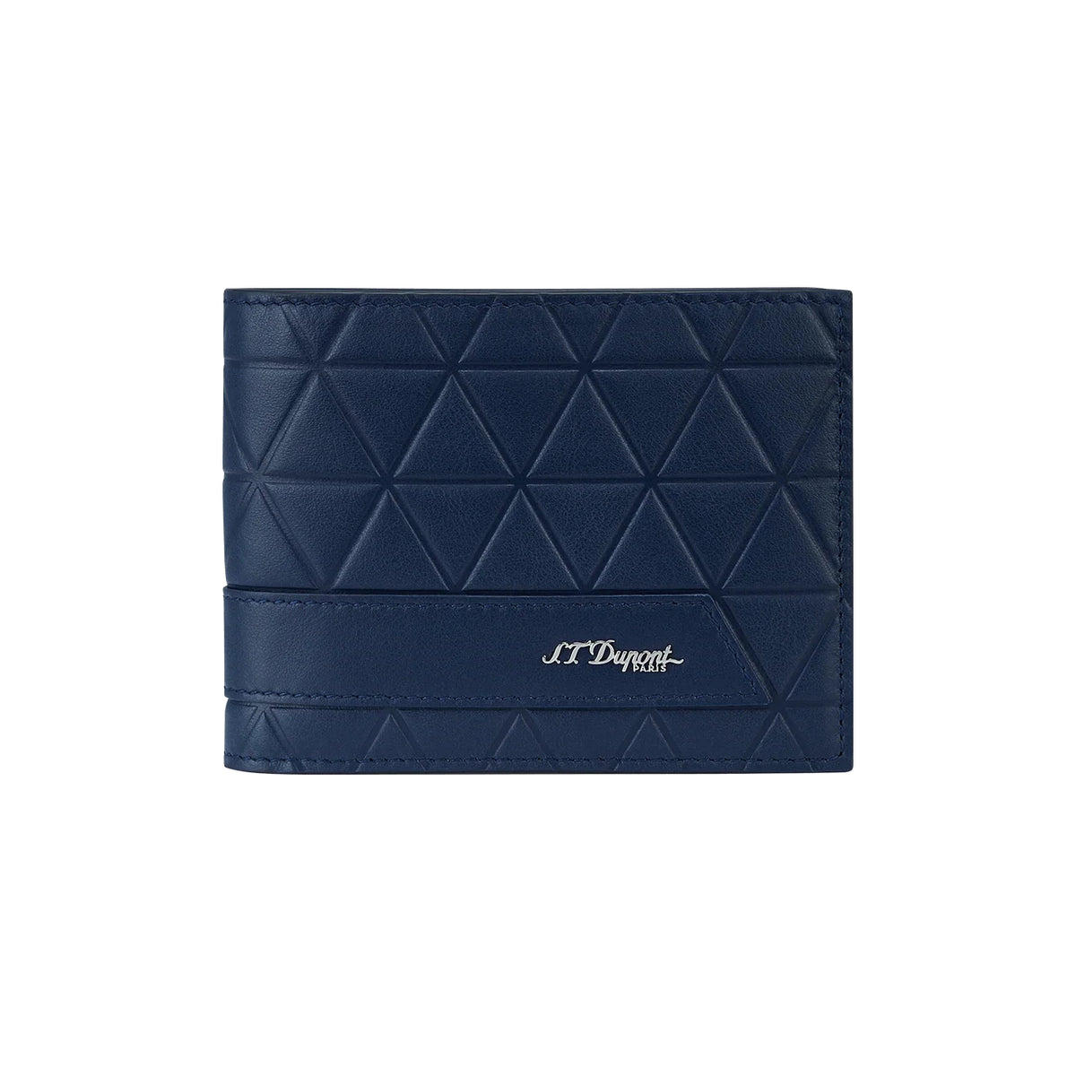 Portafoglio da Uomo della marca Dupont. L'accessorio è realizzato in pelle blu di vitello conciato, la trama è fatta a punta di fuoco con barra e cuciture ai bordi e logo Dupont decentrato a rilievo in acciaio lucido. Internamente sono presenti 8 fessure per carte e una grande all'apertura per i contanti . Le dimensioni sono 10 cm di base per 8 cm di altezza.