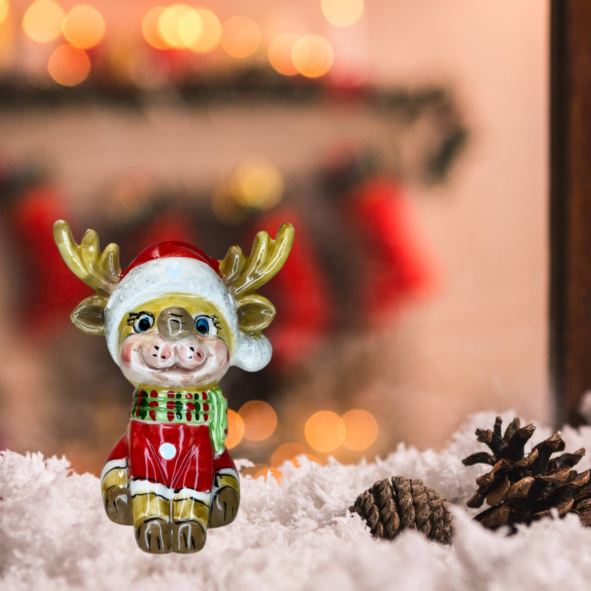 Questa bellissima scultura di Capodimonte, rappresentata da una Renna piccola con cappello natalizio, maglione rosso e sciarpa verde, con led che si accende alimentato a pile, saprà impreziosire la vostra casa nelle festività natalizie. I dettagli sono fantastici. La scultura è realizzata in ceramica, lavorazione artigianale. Altezza 13cm.