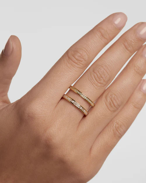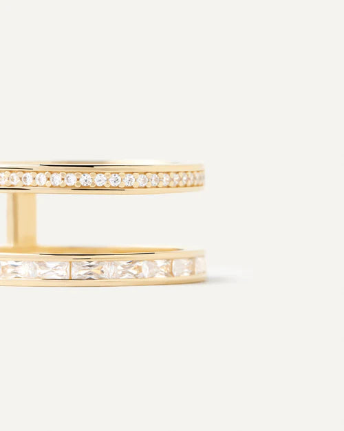 Anello da Donna della marca PDPaola, realizzato in argento dorato 925 ed rappresenta una fascia modello multi filo a due fascie con zirconi bianchi incastonati. L'anello è misura 12.