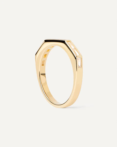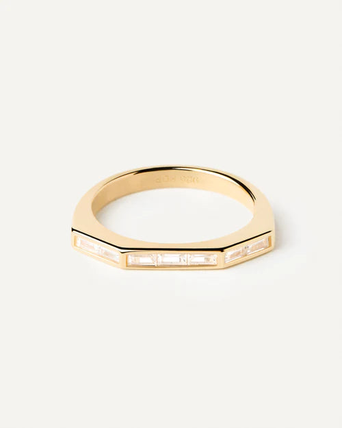Anello da Donna della marca PDPaola, realizzato in argento dorato 925 ed rappresenta una fascia modello semi esagonale con zirconi bianchi incastonati. L'anello è misura 14.
