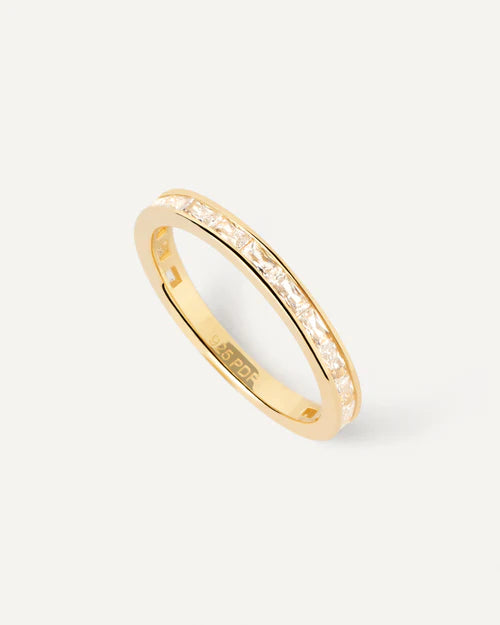Anello da Donna della marca PDPaola, realizzato in argento dorato 925 ed rappresenta una fascia modello classico con zirconi bianchi incastonati. L'anello è misura 14.