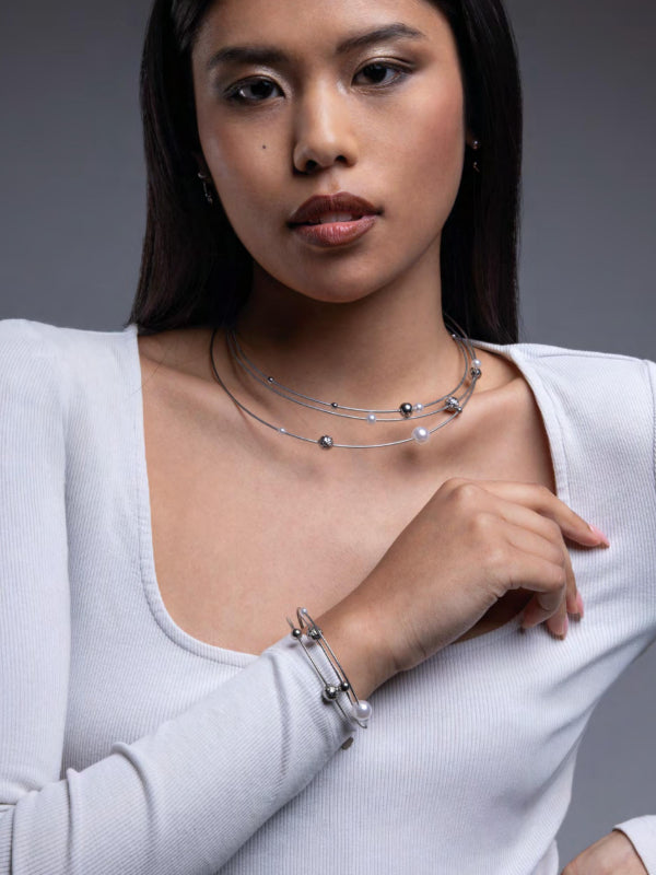 Bracciale da Donna della marca 4US Cesare Paciotti. Il giropolso è realizzato in acciaio inossidabile. La catena è una maglia veneziana rigida a tre fili con dimensioni di perle e biglie crescenti di 10 mm, 5 mm e 4 mm. La lunghezza è regolabile tra 16 cm e 21 cm grazie alla catena di allungo. La chiusura è con maglia a moschettone.