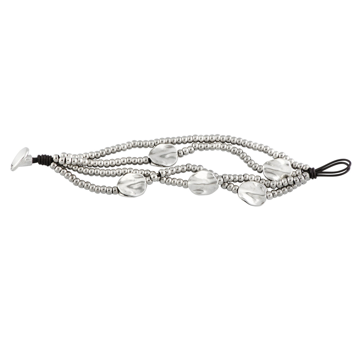 Bracciale firmato UNOde50 referenza PUL0854MTLMAR0M. Realizzato in una lega esclusiva di alluminio ed altri metalli leggeri successivamente sottoposta ad un bagno di argento di 15 micron, questo bracciale dal design originale presenta una struttura multifilo in cuoio marrone ricoperta da elementi di forma sferica o semisferica e una chiusura a bottone. Ad intravedersi tra i numerosi giri sono piccole monetine appiattite che accompagnano l'inconfondibile lucchetto UNOde50