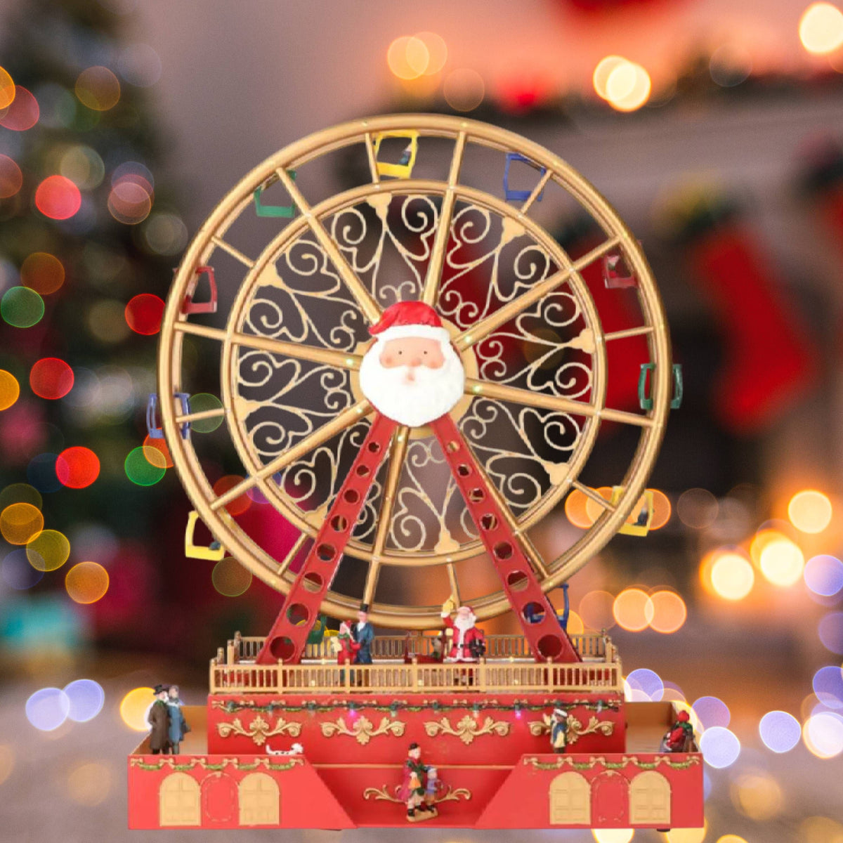 Scultura Decorativa fatta dall'azienda Il Mondo Dei Carillion. La scultura è realizzata artigianalmente, rappresenta una ruota panoramica con luci e movimenti animati, alimejntati con cavo. La funzione musicale offre due opzioni: luci e musica insieme oppure solo luci.
