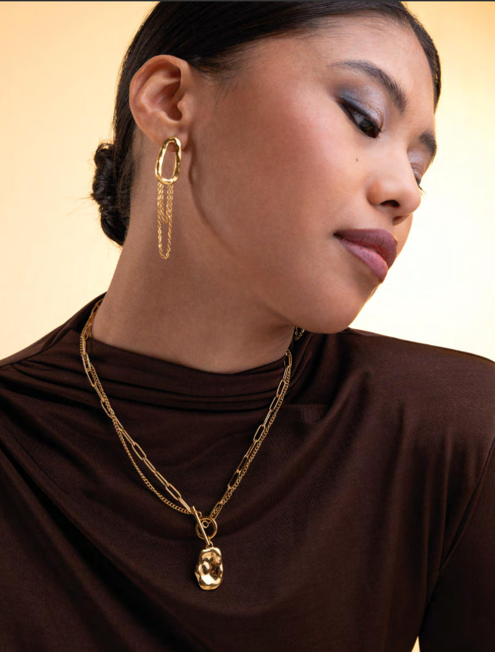 Collana da Donna della marca 4US Cesare Paciotti. Il girocollo è realizzato in acciaio inossidabile. La catena è realizzata da due fili di acciaio, una maglia è una catena groumette e l'altra è una maglia ovale, il pendente è una pepita lucida schiacciata. La lunghezza è fissa a 43 cm. La chiusura è con maglia a T-Bar.