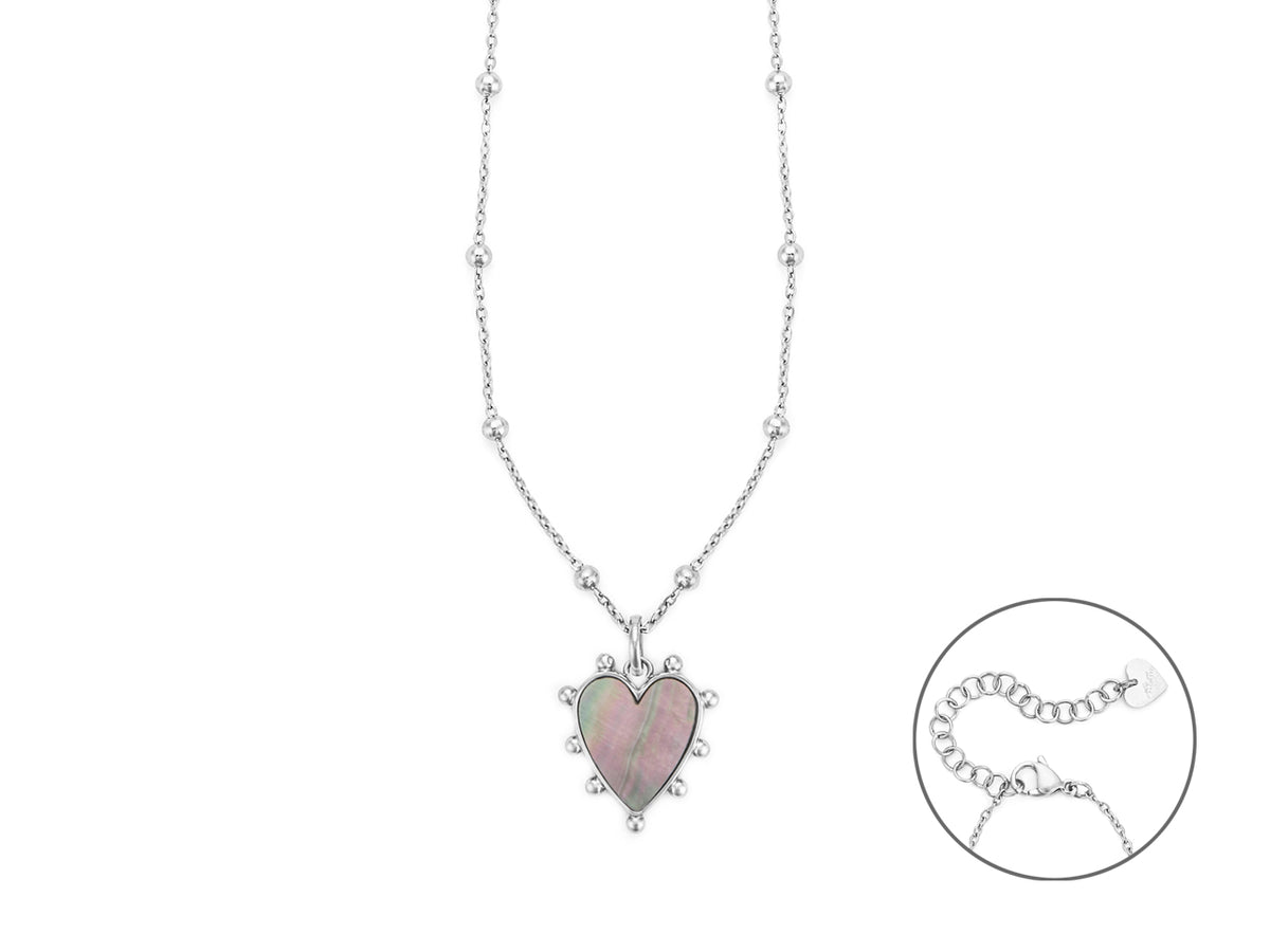 Collana da donna di 4US Cesare Pacoitti. Gioiello realizzato in Acciaio con Biglie e cuore pendente in simil madreperla. La lunghezza della collana è di 45 cm regolabile tramite longhina con anellini e chiusura con maglia a moschettone. La referenza è: 4UBR7723W