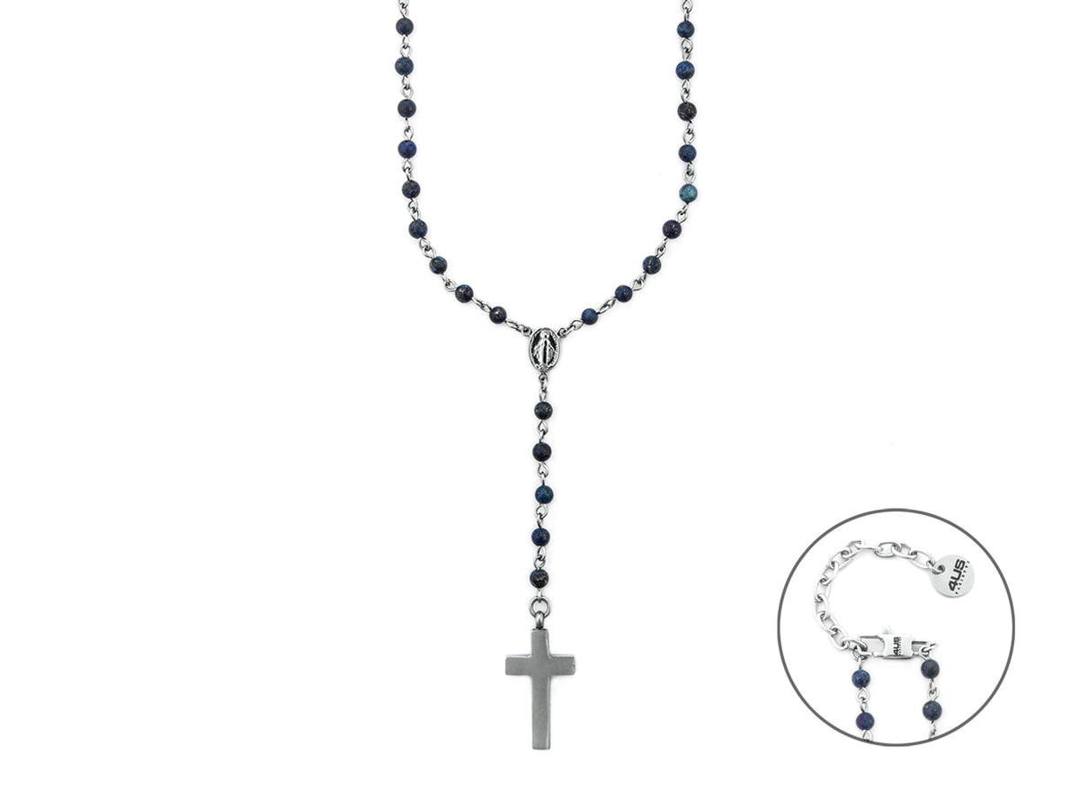 Collana da Uomo del brand 4US Cesare Paciotti. Il girocollo è realizzato da una catena modello Rosario a Y in Acciaio sulla quale vengono infilate con mini Biglie di lapis . La lunghezza totale del girocollo è di 55 cm regolabile fino a 50 cm grazie agli anellini di longhina, da considerare 10 cm in più per la catena con croce pendente. La chiusura è con maglia a moschettone.