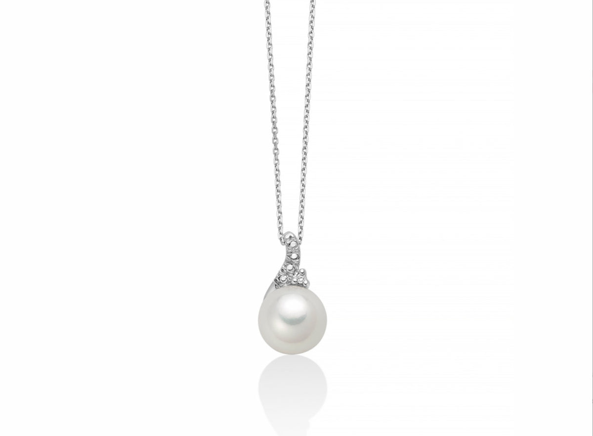 Collana da Donna della marca Miluna, la catena è una maglia rollò lucida realizzata in oro bianco 18 KT con perla d'acqua dolce pendente che misura 7.5-8 mm, la montatura è a punta con diamanti bianchi incastonati dalla caratura di 0,06 CT. La lunghezza è 45 cm, la chiusura è a maglia moschettone.
