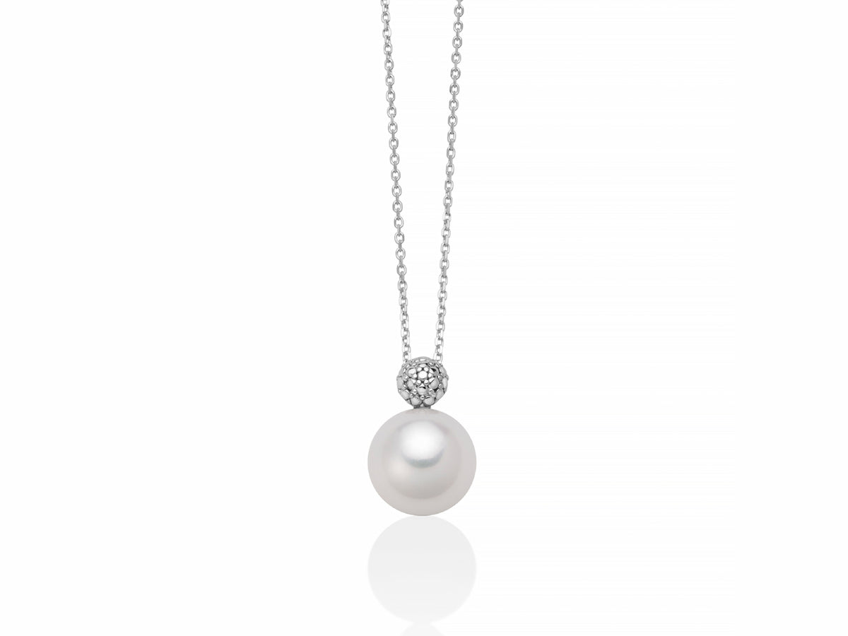 Collana da Donna della marca Miluna, la catena è realizzata in oro bianco 18 KT con perla d'acqua dolce pendente 8-8,5 mm, effetto pallini che somigliano a diamanti, la lunghezza è 45 cm, la chiusura è al moschettone in oro bianco.