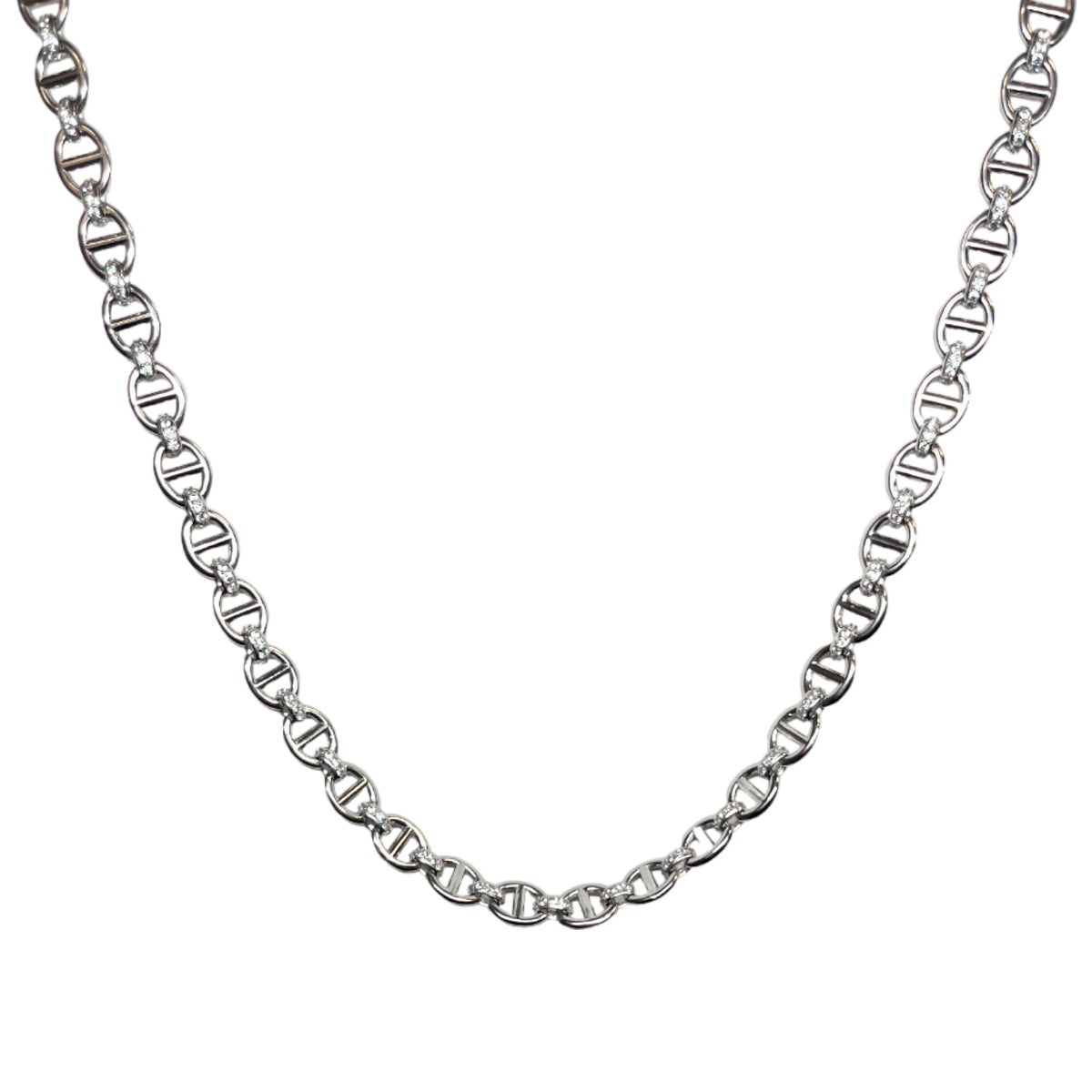 Collana da Donna prodotta da Re Mida realizzata artigianalmente dai nostri laboratori. Il gioiello è fatto in Argento 925 modello Choker Girocollo con catena Maglia Marinara e zirconi bianchi da mm incastonati a mano sui ponti di collegamento. La lunghezza massima è 42 cm (vedi ultima foto) ma può essere regolata anche più piccola fino a 38 cm grazie agli anellini di longhina. La chiusura è con maglia a moschettone.