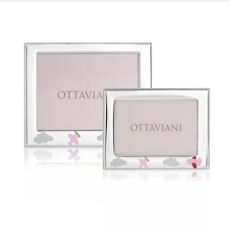 Portafoto Ottaviani In Argento 999, moderno ed elegante con un design che esprime gioia per la nascita di una bimba, perfetta per arredare ogni cameretta o ambiente dove si voglia portare una nuova gioia. Con una fascia larga in mirò silver colore argento bianco in basso troviamo nuovolette e aereoplanini rosa.