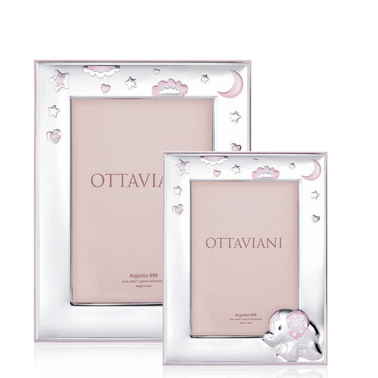 Portafoto Ottaviani In Argento 999, moderno ed elegante con un design che esprime gioia per la nascita di una bimba, perfetta per arredare ogni cameretta o ambiente dove si voglia portare una nuova gioia. Con una fascia larga in mirò silver colore argento bianco in basso troviamo una piccola elefantina leggermente in rilievo.