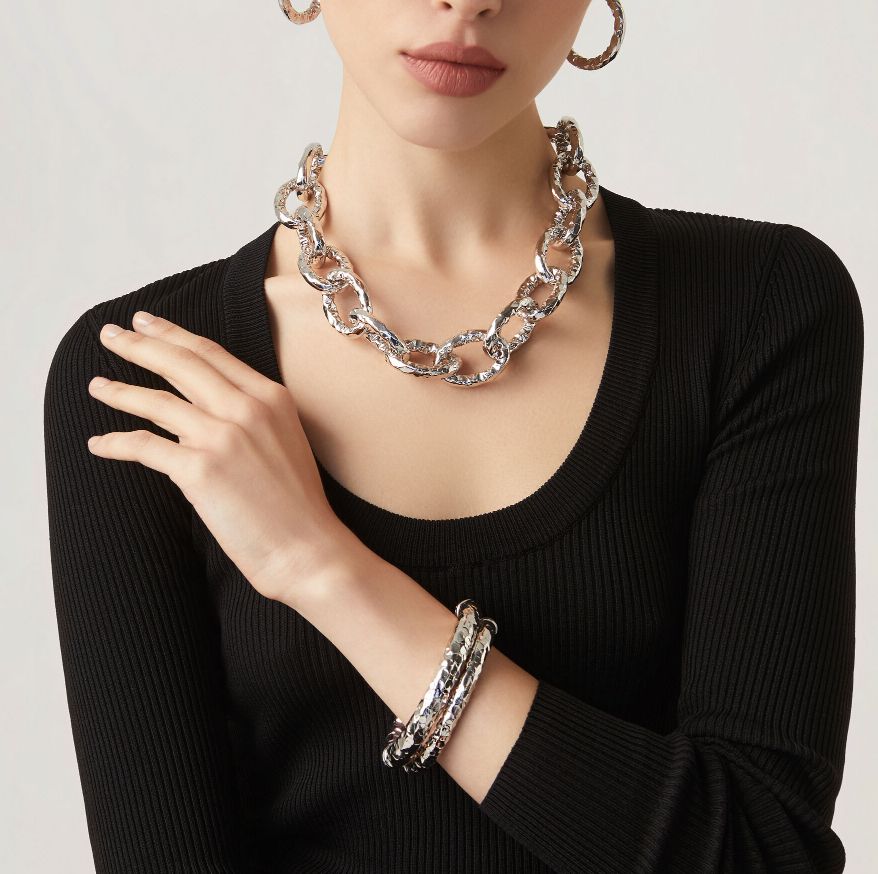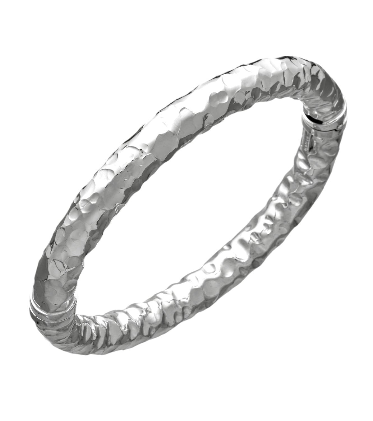 Bracciale da Donna della marca Giovanni Raspini, il gioiello è realizzato in argento bianco 925 ed è fatto a mano in Italia, raffigura un giropolso semirigido con lavorazione martellata e sfaccettata lucida che da un tocco di originalità e ed particolarità al giropolso. L'apertura è a manetta. La misura totale è 19 cm.