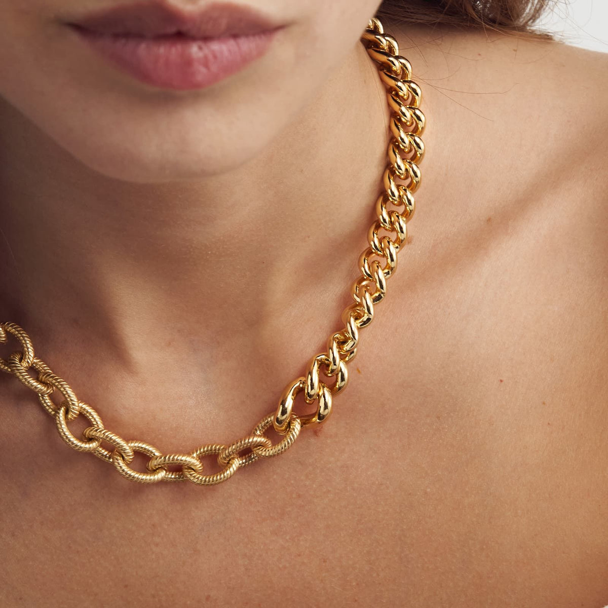 Collana di catena grumetta ovale liscia e forzatina godronata in bronzo con bagno in oro giallo 24 kt. Chiusura con moschettone e medaglietta con logo. Rendendo omaggio alla storica produzione di gioielli in catena, UNOAERRE crea in un audace mix & match di stili, un accessorio dal fascino unico e contemporaneo pensato per sorprendere. Lunghezza 42,00 cm.