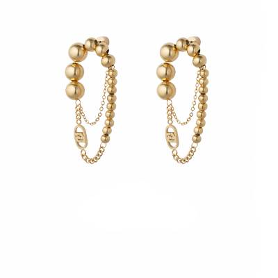Orecchini pendenti con perle in acciaio dorato. Mix di catene e perle metalliche. Chiusura a farfalla. Lunghezza: 5 cm