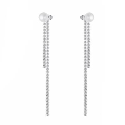 Orecchini da Donna della marca Liu Jo, il gioiello è realizzato in Acciaio color silver, con catene pendenti con zirconi e perla. La lunghezza è di 9 cm. Chiusura con barilotto.