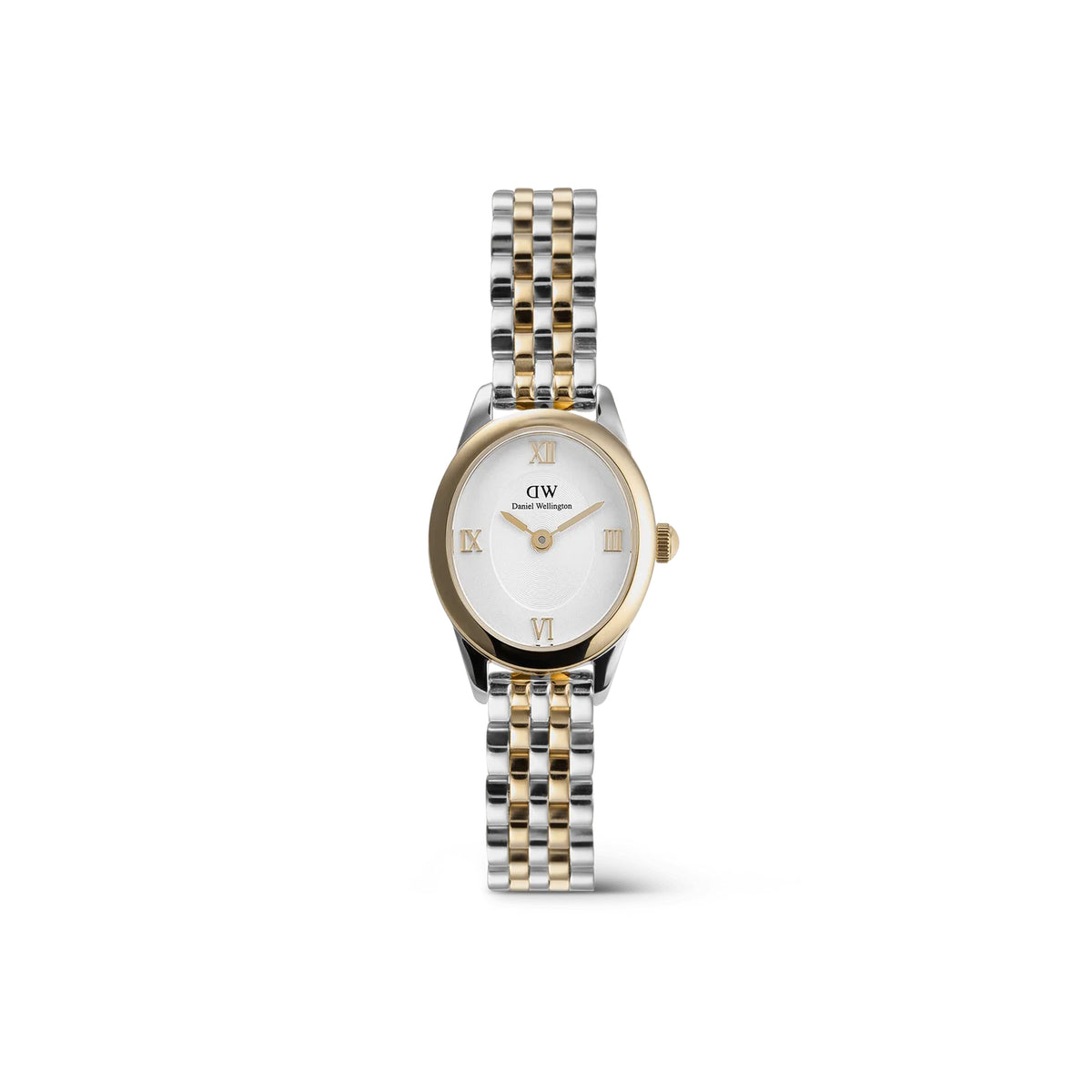 Orologio da Donna della marca Daniel Wellington. Il segnatempo ha un meccanismo al quarzo solo tempo, la cassa ovale misura 22x25.5 mm in acciaio bicolore dorato lucido, il quadrante è di colore argentè con lancette ed indici in acciaio dorato. Il cinturino è in acciaio bicolore dorato maglia effetto jubilè. La chiusura è una doppia deployante. Il vetro è minerale, la corona è a trascinamento, la resistenza all'acqua è di 3 ATM.