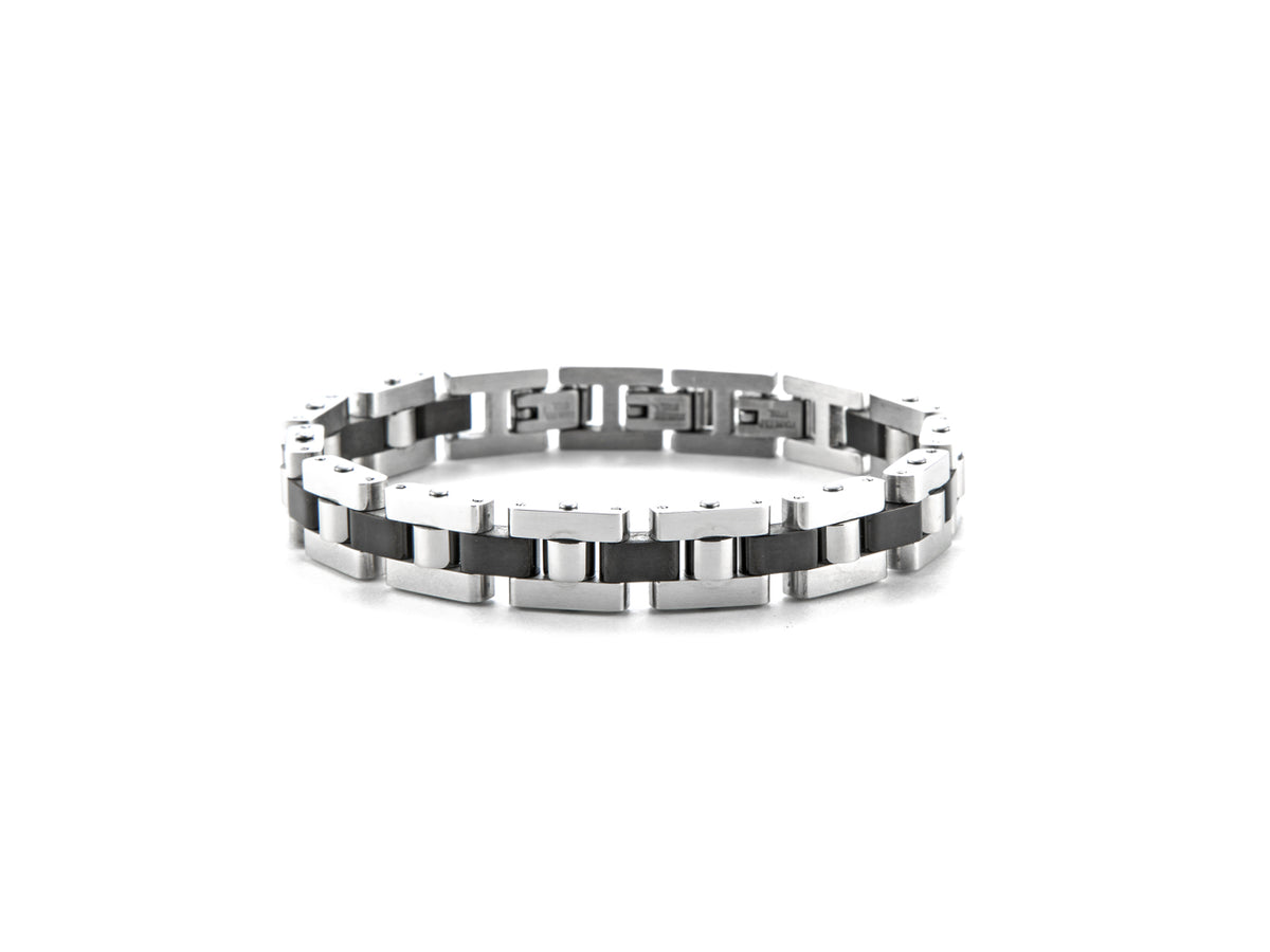 Bracciale Uomo della Marca 4US di Cesare Paciotti, il gioiello è composto da una catena di acciaio lucido, modello giropolso impreziosito dalla lavorazione delle maglie in acciaio e dalla ceramica nera, la lunghezza da 18 cm a 21 cm è regolabile grazie alle placchette di chiusura, la chiusura è ad maglia a scatto.