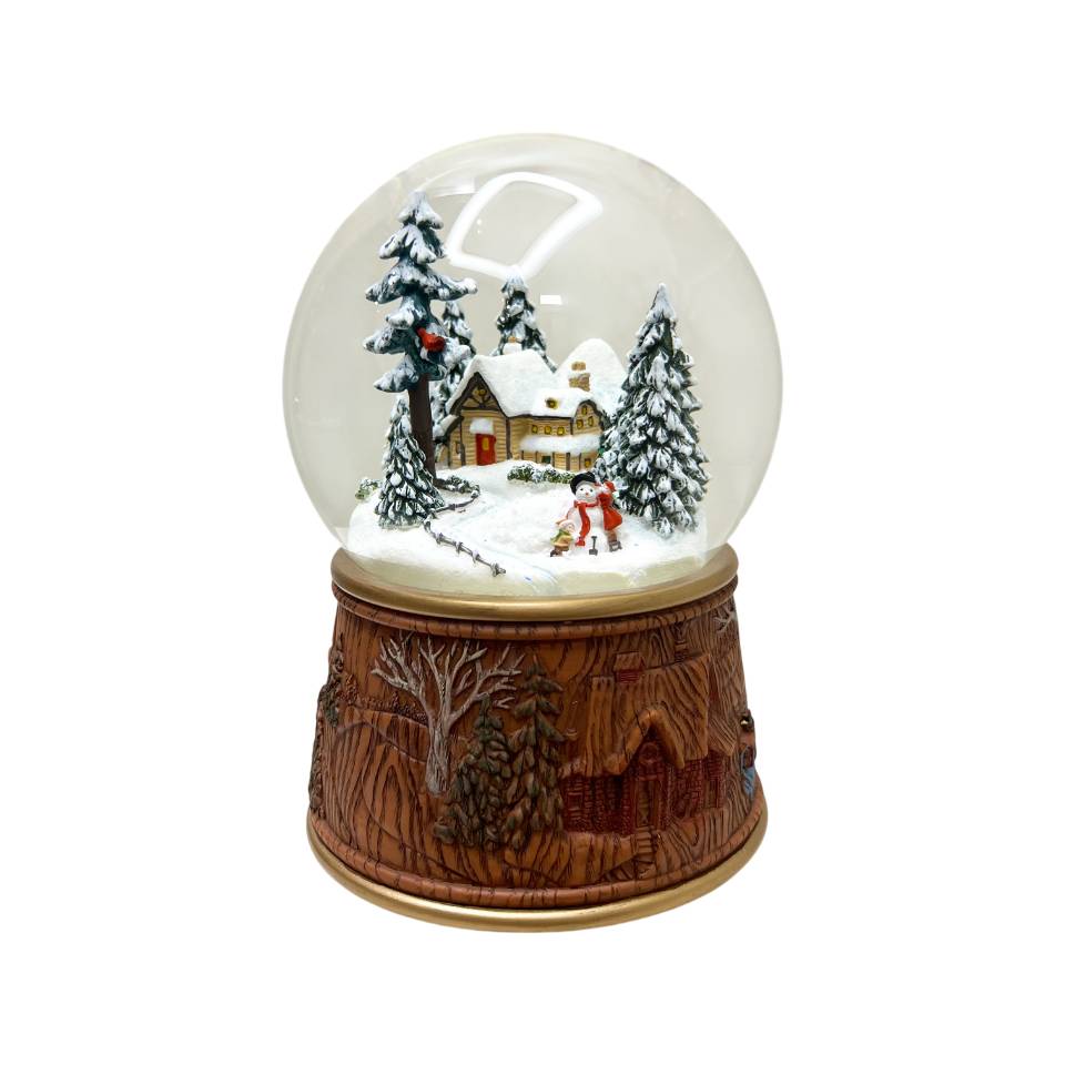Scultura Decorativa fatta dall'azienda Il Mondo Dei Carillion. La scultura è realizzata artigianalmente. All'interno della sfera, ripiena di neve e brillantini, rappresenta un paesaggio con una casetta con un pupazzo di neve.
