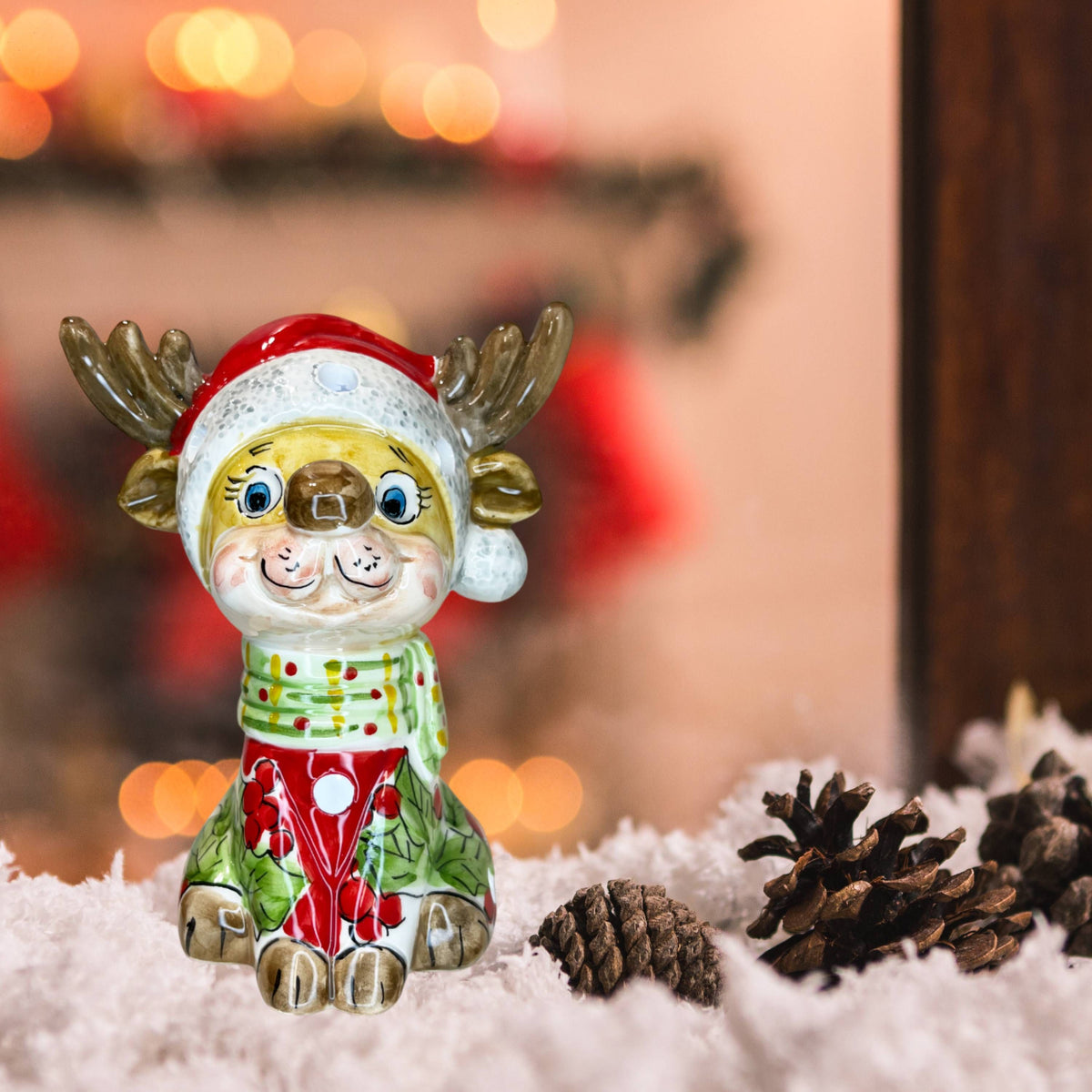 Questa bellissima scultura di Capodimonte, rappresentata da una Renna grande con cappello natalizio, maglione rosso e sciarpa verde, con led che si accende alimentato a pile, saprà impreziosire la vostra casa nelle festività natalizie. I dettagli sono fantastici. La scultura è realizzata in ceramica, lavorazione artigianale. Altezza 19cm.
