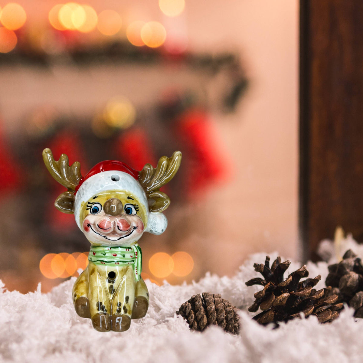 Questa bellissima scultura di Capodimonte, rappresentata da una Renna piccola con cappello natalizio e sciarpa verde, con led che si accende alimentato a pile, saprà impreziosire la vostra casa nelle festività natalizie. I dettagli sono fantastici. La scultura è realizzata in ceramica, lavorazione artigianale. Altezza 13cm.