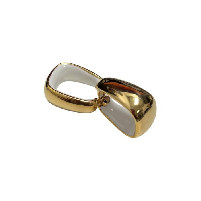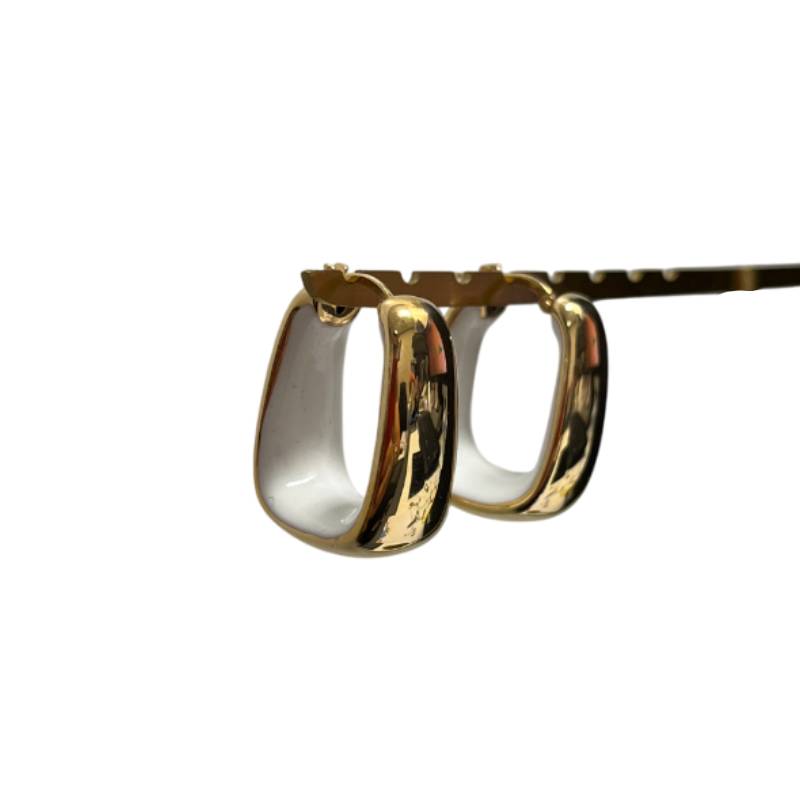 Orecchini da Donna prodotti dalla marca Le Gioie di Mavi. Sono un'azienda artigianale che realizza tantissimi gioielli arricchiti con smalto di vari colori. La coppia di orecchini è formata da due cerchi ovali squadrati in argento dorato 925 e smalto di colore bianco applicato all'interno. Il diametro interno è di 2 cm, l'altezza è di 2,5 cm. La chiusura è con perno a scatto.