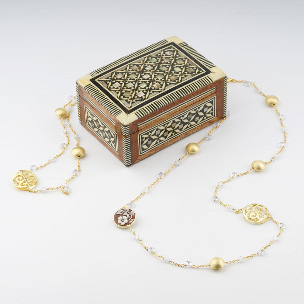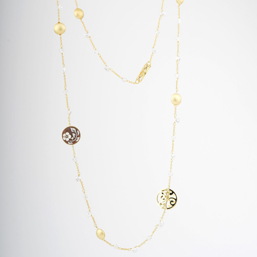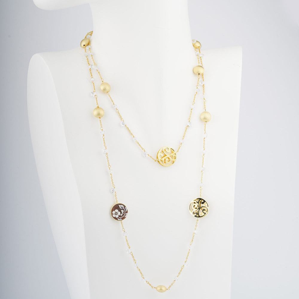 Collana da Donna della marca Cameo Italiano, il gioiello è realizzato in Argento Dorato 925 ed è fatto a mano in Italia, raffigura un filo lungo con fiore inciso su cammeo marrone ed biglie lavorate satinate ed parti della collana traforate, il filo è lavorato con dettagli che ricordano uno stile classico vintage. La misura totale è 120 cm. La chiusura è a maglia a moschettone