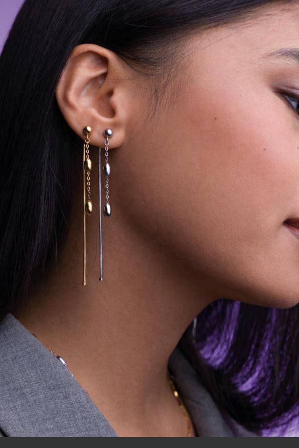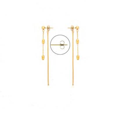 Orecchini da Donna della marca 4US Cesare Paciotti. Gli orecchini sono realizzati in acciaio inossidabile con finitura PVD oro. Gli orecchini pendenti a lobo e sulla vite con sfere in PVD oro. La lunghezza è di 4 cm e 7,5 cm. La chiusura è a farfallina.