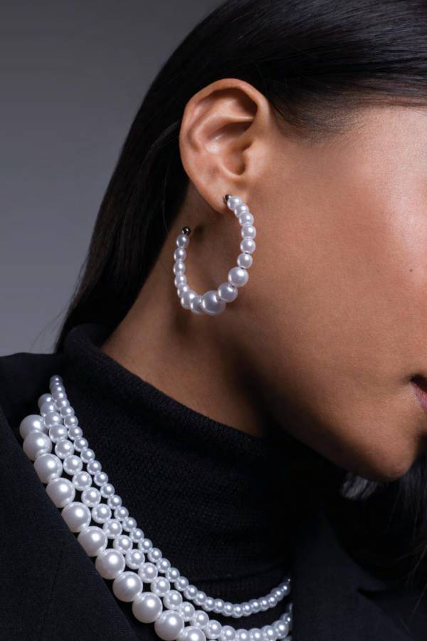 Orecchini da Donna della marca 4US Cesare Paciotti. Gli orecchini sono realizzati in acciaio inossidabile. Gli orecchini, semicerchio, con perle bianche. La lunghezza è di 5 cm. La chiusura è a farfallina.