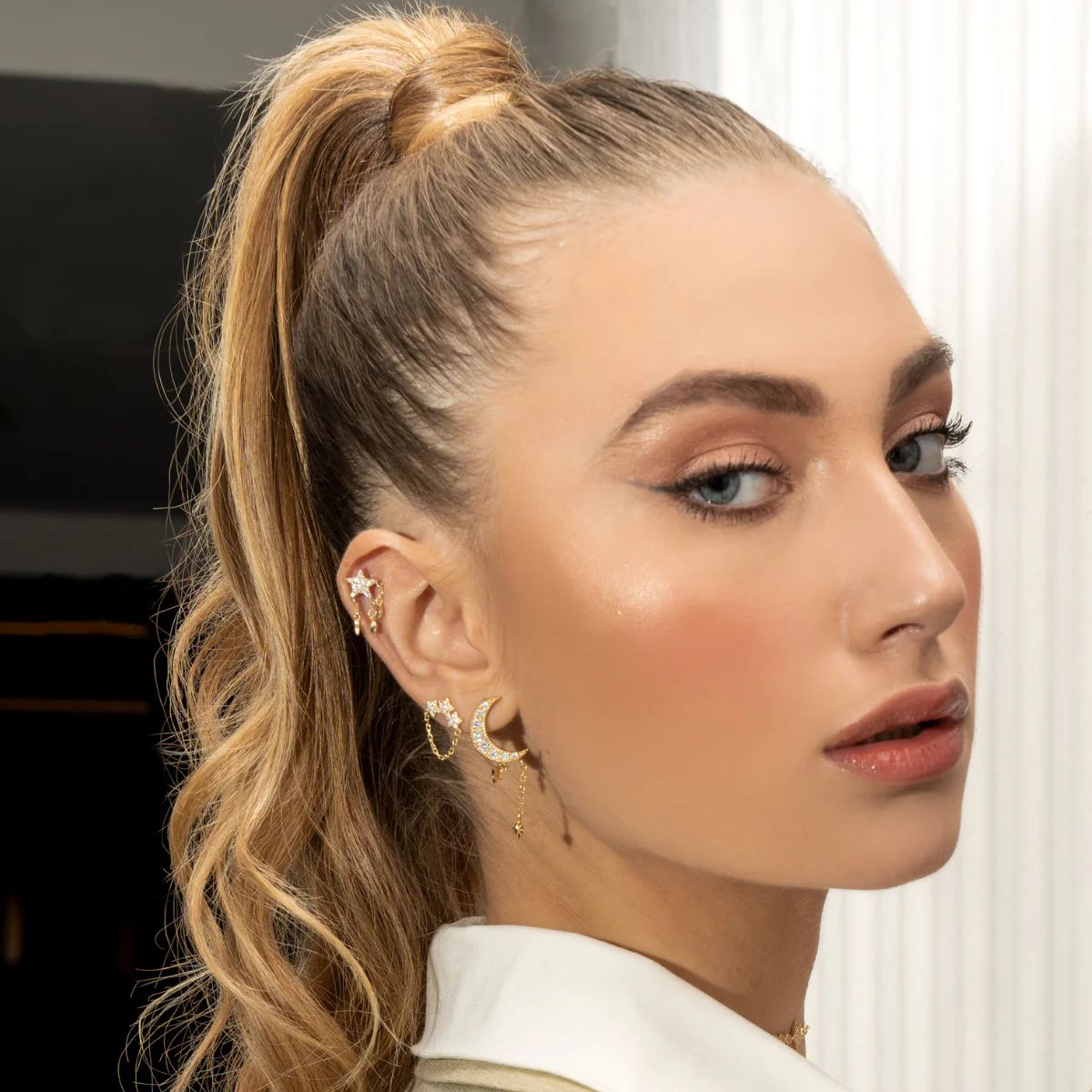 Orecchini da Donna della marca Laura P., il gioiello è realizzato in Argento 925 dorato ed è fatto in Italia, raffigura una stella con Zirconi Bianchi ed ciondoli pendenti a forma di mezze lune e stelline.  La chiusura è con vitarella.