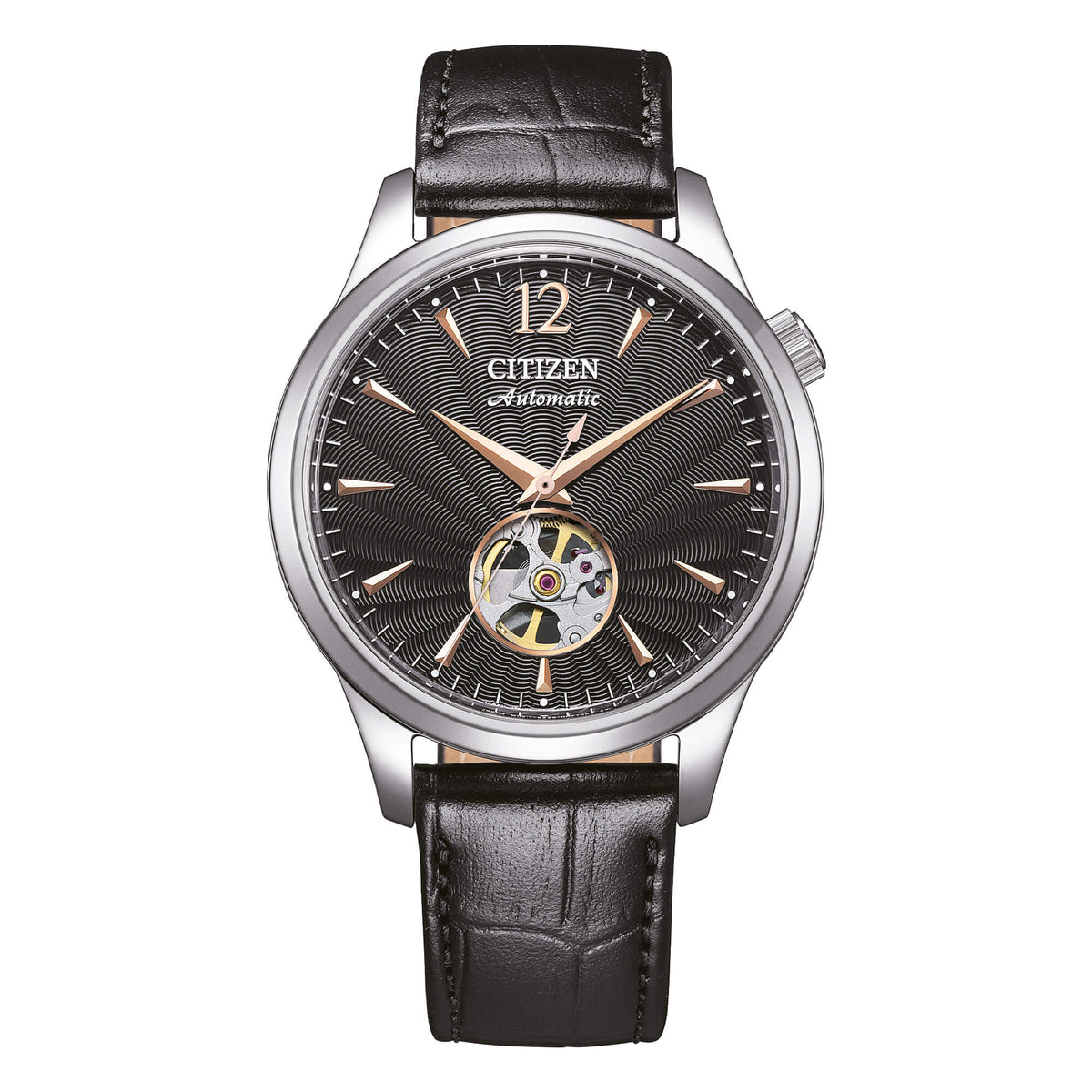 Orologio Uomo della marca Citizen, il segna tempo ha un meccanismo automatico Miyota con 48 ore di riserva di carica, il quadrante è di colore nero con effetto raggi dal centro verso l'esterno, gli indici e le lancette sono a bastoni in acciaio rosè. Ad ore 6 è presente l'apertura del quadrante anche detta "Open Heart" attraverso la quale si vede l'oscillazione del bilanciere. Il cinturino è in pelle nera tartarugata, la ghiera è fissa (non girevole) in acciaio, il vetro è minerale, la corona è a trascinamento, la resistenza all'acqua è di 10 atm.