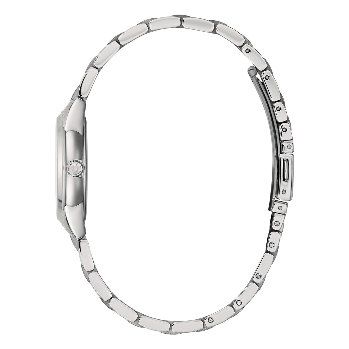 Orologio da Donna della Marca Bulova della collezione Rubaiyat. Il segnatempo ha una cassa in acciaio lucido con diametro di 28 mm. La ghiera è fissa in acciaio lucido. Il quadrante è di colore rosa con lavorazione lucida sfaccetata, ha indici con 3 diamanti incastonati e lancette a bastoni in acciaio rosè lucido. Il movimento è un Quarzo solo tempo. La corona è a trascinamento in acciaio. Il vetro è minerale. Il cinturino è in acciaio lucido. La chiusura è una deployante con pulsante logata bulova. La resistenza all'acqua è di 5 atm.