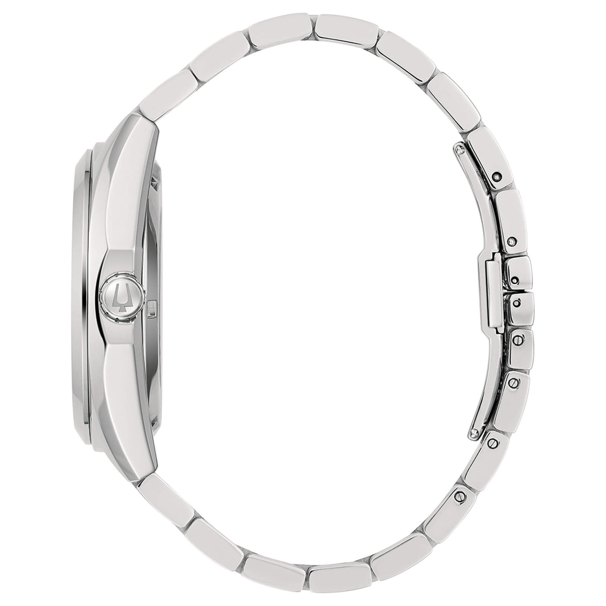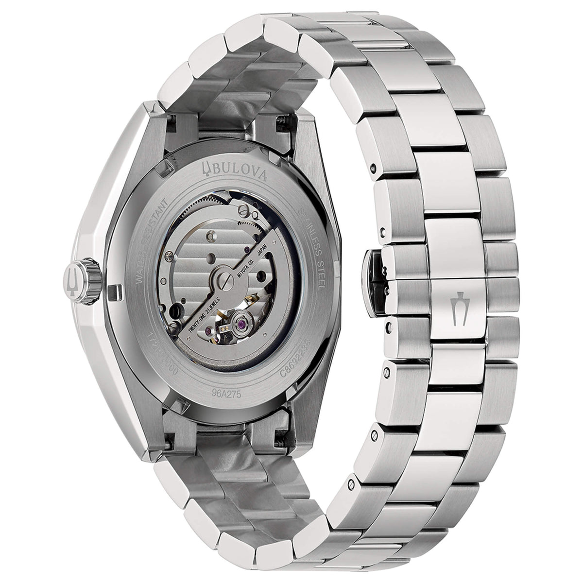 Orologio da Uomo della Marca Bulova della collezione Surveyor Automatic. Il segnatempo ha una cassa in acciaio lucido effetto esagonale con diametro di 42 mm. La ghiera è fissa in acciaio lucid. Il quadrante è di colore blu con lavorazione lucida e ad ore 6 è presente l'apertura per vedere l'oscillazione del bilanciere, ha indici a bastoni e lancette in acciaio lucido. Il movimento è un Automatico Solo Tempo da 21 rubini con 40 ore di riserva di acrica. La corona logata è a trascinamento in acciaio. Il vetro è minerale piano. Il cinturino è in acciaio con lavorazione lucida e satinata. La chiusura è una doppia deployante con pulsanti logata Bulova. La resistenza all'acqua è di 5 atm.