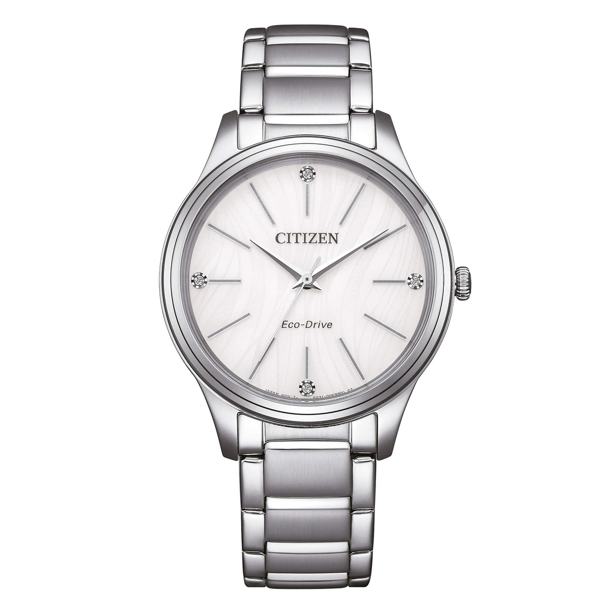 Orologio Donna della marca Citizen, il segna tempo ha un Meccanismo Quarzo Solo Tempo modello Eco-Drive, un brevetto esclusivo di Citizen che rende questo orologio un prodotto a ricarica solare di alta qualità, potendo rimanere in riserva di carica (ossia in un luogo completamente oscuro) per più di otto mesi. La cassa ha un diametro di 34 mm realizzata in acciaio lucido e satinato, il quadrante ha un colore bianco chiaro con lavorazione effetto glitter, gli indici sono a bastoni e le lancette sono a bastoni in acciaio. Il cinturino è in acciaio maglia classica con lavorazione satinata, la ghiera è fissa (non girevole) in acciaio lucido, il vetro è minerale, la corona è a trascinamento, la resistenza all'acqua è di 5 atm.