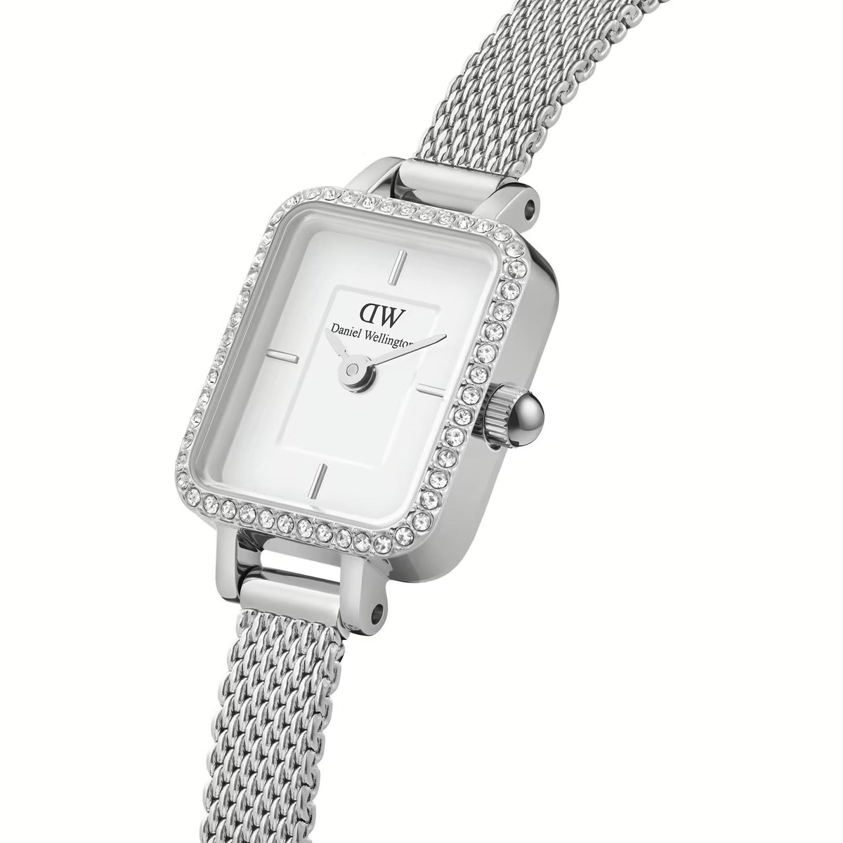 Orologio da Donna di Daniel Wellington della collezione Quadro Mini. Il movimento è al quarzo solo tempo. La cassa quadrata ha un diametro di 15.4x18.2mm con zirconi bianchi incastonati. Il quandrante è di colore bianco con indici e due lancette in acciaio. Il cinturino è ad maglia milano in acciaio dello spessore di 6 mm e la Lunghezza del cinturino è tra 133-204mm. Resistenza all'acqua di 3 ATM.