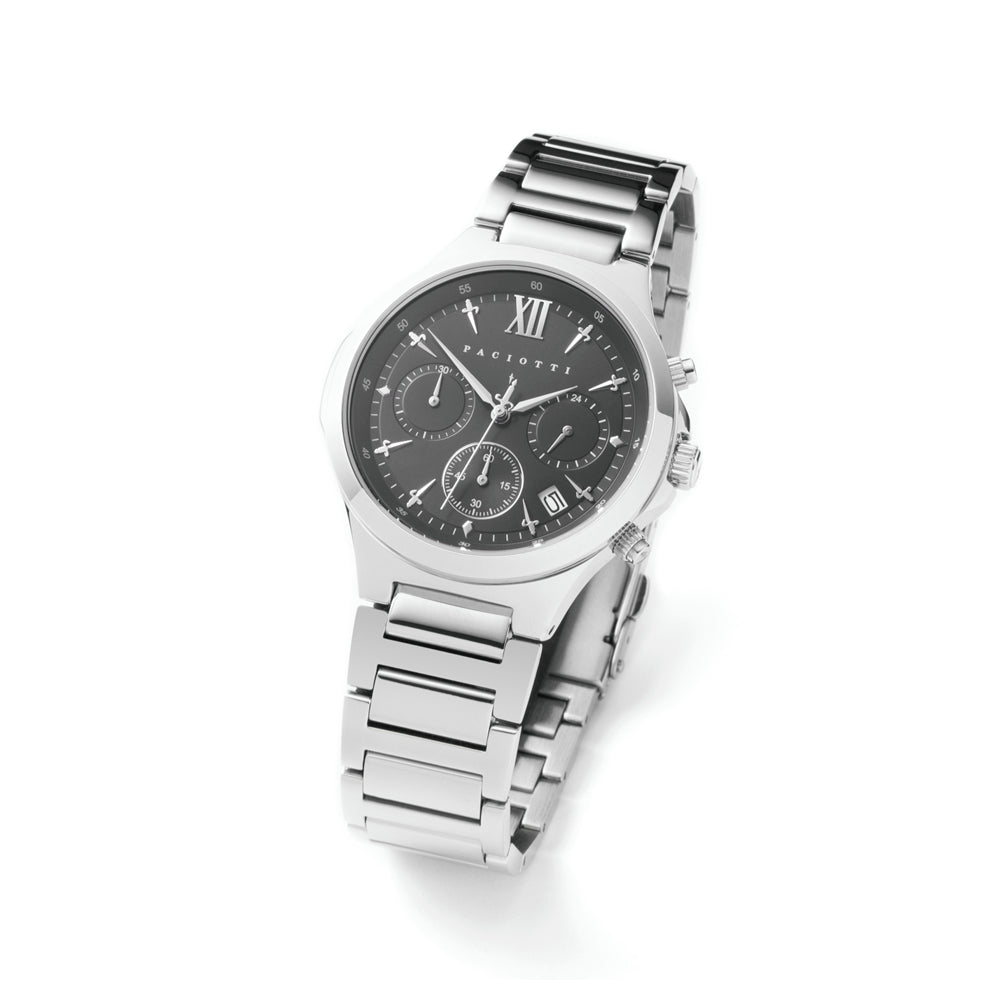 Orologio da Uomo della marca Cesare Paciotti, il Cronografo ha un Meccanismo al Quarzo con caratteristica della Data, la cassa è rotonda squadrata ed misura 43 mm in acciaio lucido, il quadrante è nero lucido con lancette ed indici in acciaio argentato, il cinturino è in Acciaio Lucido, la ghiera è in acciaio lucido, il vetro è minerale, la corona Logata con Spadino è a trascinamento, la chiusura è una deployante, la resistenza all'acqua è di 10 atm.