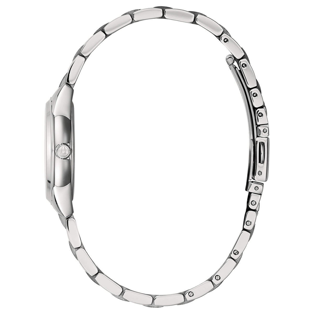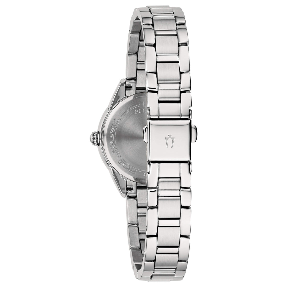 Orologio da Donna della Marca Bulova della collezione Lady Sutton. Il segnatempo ha una cassa in acciaio lucido con diametro di 28 mm. La ghiera è fissa in acciaio lucido. Il quadrante è di colore argentè con lavorazione lucida effetto soleil, ha indici con e lancette a bastoni in acciaio lucido, alle ore 3,6,9 sono incastonati dei piccoli diamanti naturali. Il movimento è un Quarzo solo tempo. La corona è a trascinamento in acciaio. Il vetro è minerale. Il cinturino è in acciaio bicolore lucido. La chiusura è una deployante con pulsante logata bulova. La resistenza all'acqua è di 5 atm.
