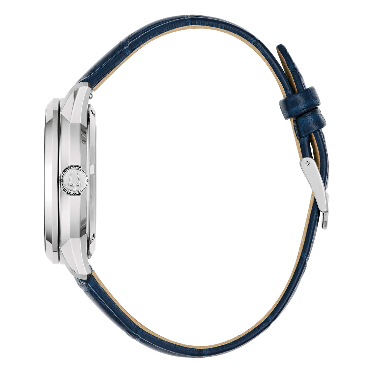 Orologio da Uomo della Marca Bulova, collezione Sutton Skeleton Automatic. Orologio con cassa in acciaio lucido e satinato con diametro di 40 mm. La ghiera è in acciaio lucido. Il cinturino è in pelle blu, la chiusura è una doppia deployante in acciaio. Il quadrante è di colore bianco con lavorazione Cotè De Geneve ha indici a bastoni e lancette in acciaio blu lucide, il quadrante è scheletrato e permette di vedere il meccanismo. Il movimento è automatico solo tempo con 21 rubini e 40 ore di riserva di carica. La corona è a trascinamento. La resistenza all'acqua è di 3 atm.
