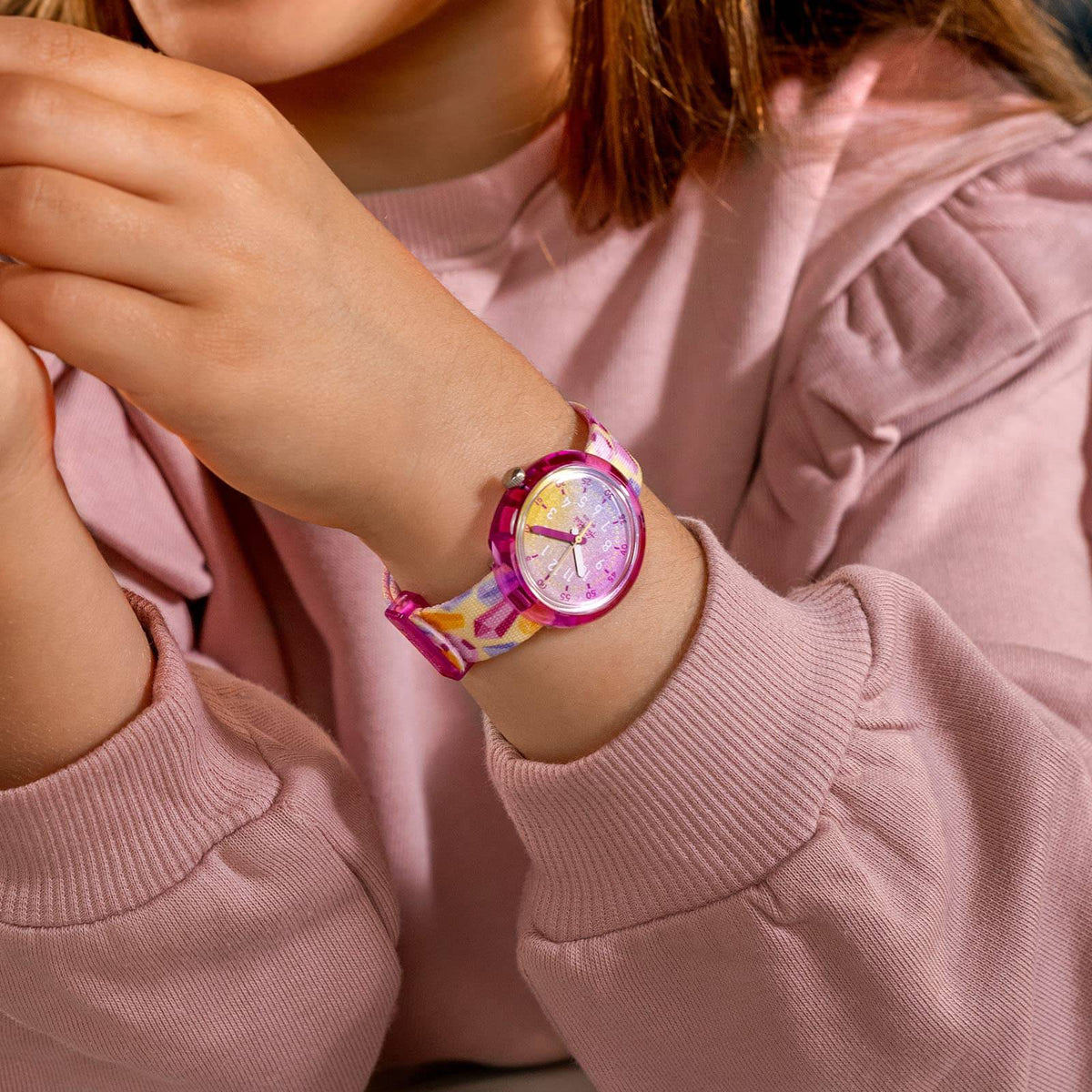 Orologio da Bambina della Marca Swatch modello Flik Flak Sparkling Gemstones, il solo tempo ha un meccanismo al quarzo, la cassa è in plastica riciclata ed misura 32 mm, il quadrante è di colore rosa e viola con numeri viola, il cinturino è in pet riciclato bianco con fantasia delle pietre, l'impermeabilità è di 3 atm.