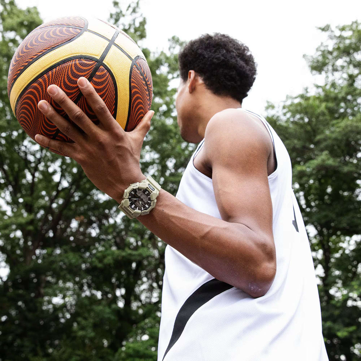Orologio da Uomo della marca Casio modello G-Shock, il giropolso ha un meccanismo al quarzo Analogico-Digitale con batteria che dura 10 ANNI, le funzioni sono di cronografo, timer, sveglia (fino a 4 allarmi), fusi orari mondiali. La cassa misura 51 mm in resina beige, il quadrante è nero con dettagli bianchi, ha un display bianco con numeri neri, il cinturino è in gomma rinforzata di colore beige, le lancette sono in acciaio grigio, il vetro è minerale, i pulsanti sono a pompa, la resistenza all'acqua è di 20 atm.