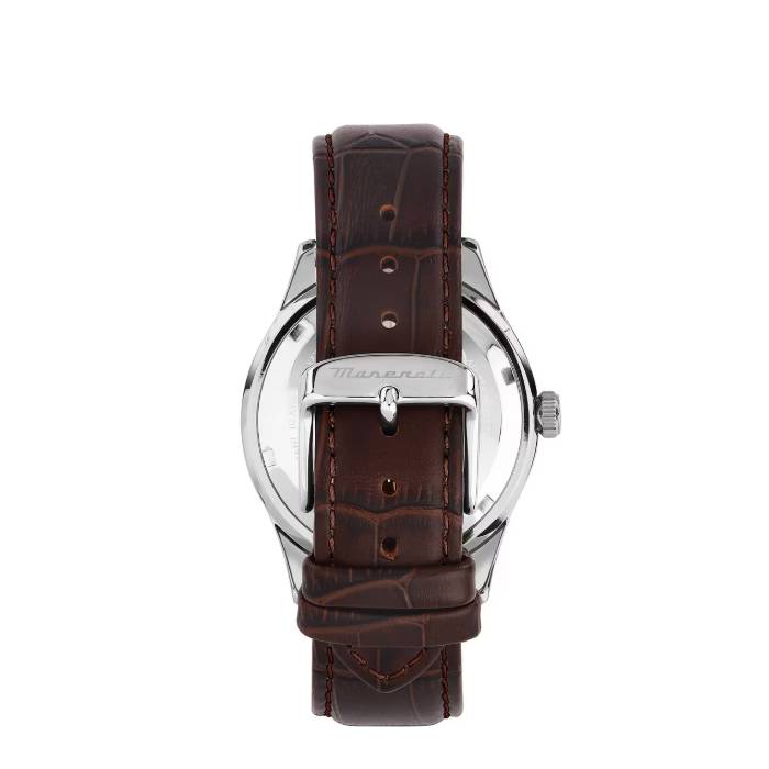 Orologio Uomo Maserati Sorpasso. Un magnifico segnatempo con movimento al quarzo e funzione di solo tempo. Una colorazione unica con cassa rosè, quest'ultima della dimensione di 40 mm. Cinturino in pelle marrone. Con una resistenza di 10 atm e vetro minerale che copre un dial bianco con datario ore 3.