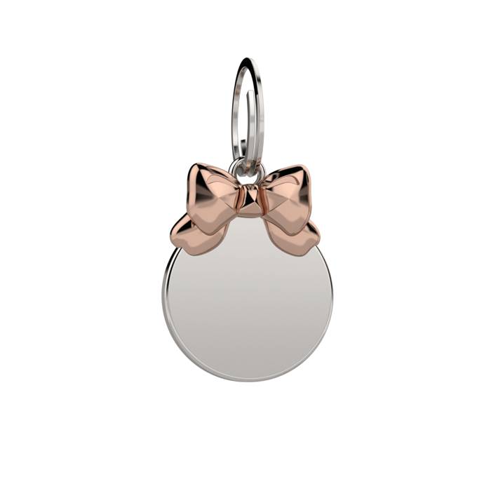 Medaglina Pets della marca Liu Jo, il gioiello è realizzato in Acciaio, raffigura una medaglia a forma tonda con fiocco rosè lucido. La lunghezza è di 3 cm. L'anellino per l'aggancio e ad spirale.