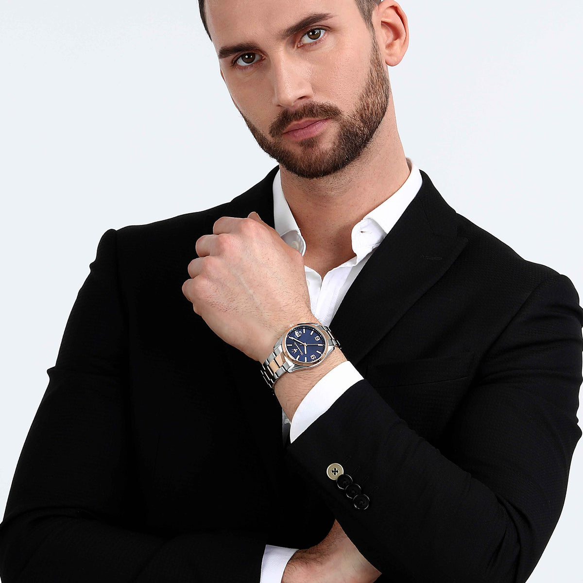 Orologio da uomo della marca Maserati, il solo tempo ha un meccanismo al quarzo con data, la cassa misura 44 mm in acciaio bicolore lucido, il quadrante è blu lucido con lancette ed indici in acciaio rosè, il cinturino è in acciao bicolore lucido e satinato, la ghiera è in acciaio rosè lucido, il vetro è minerale, la resistenza all'acqua è di 5 atm.