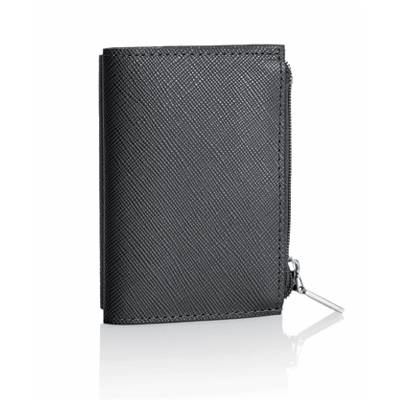 Portafoglio compatto con portacarte automatico, portamonete e protezione RFID, in vera pelle saffiano nera. Misure cm 10x7x3,3.
