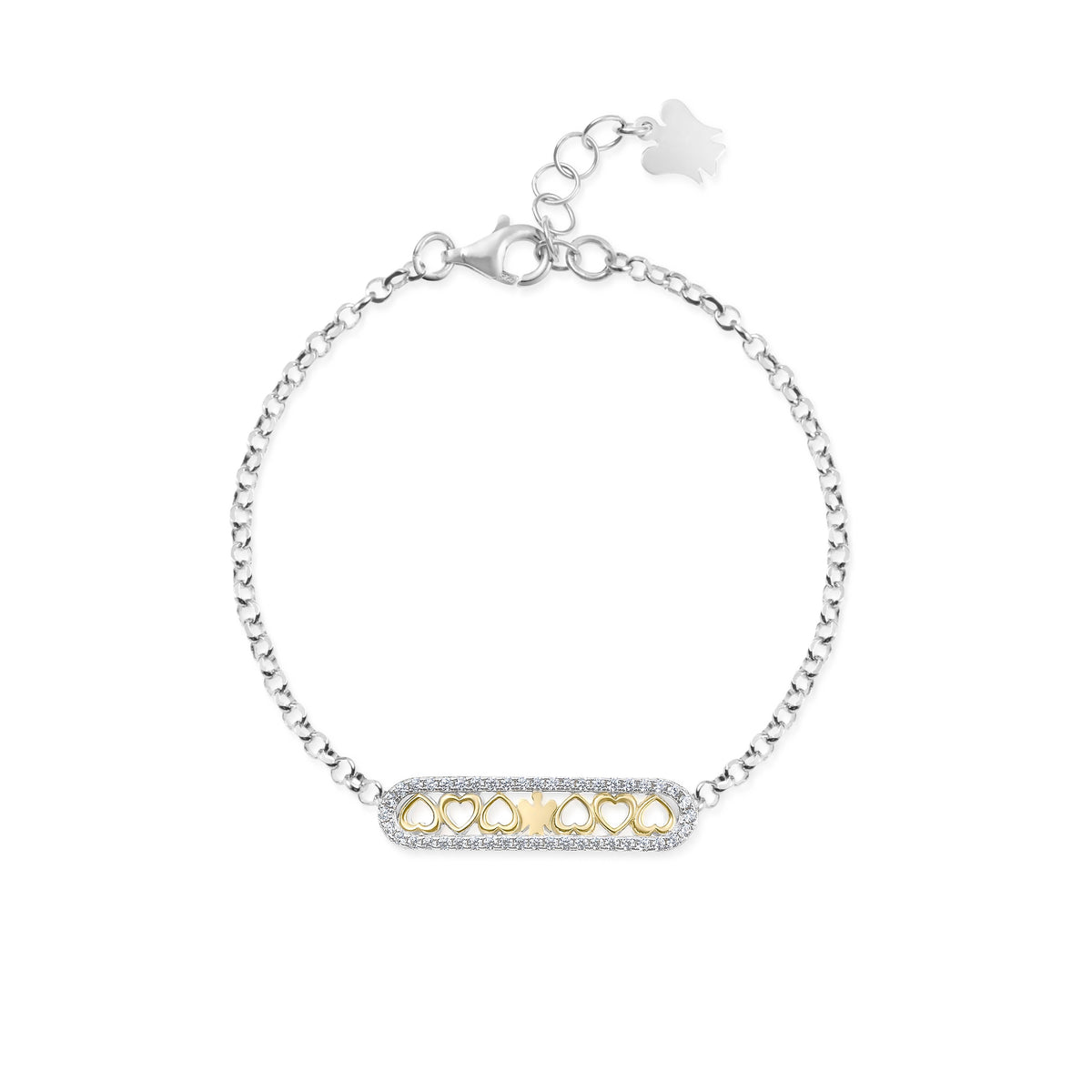 Bracciale da Donna della marca Roberto Giannotti. Il giropolso è realizzato in Argento 925. Il gioiello, caratterizzato da una maglia a catena a rolò, è impreziosito da un centrale di forma rettangolare circondato da zirconi bianchi con all'interno dei cuori in argento 925 con placcatura oro giallo e da un piccolo angelo in Argento 925 con placcatura oro giallo. Lunghezza regolabile da 17 a 19 cm. Chiusura con moschettone.