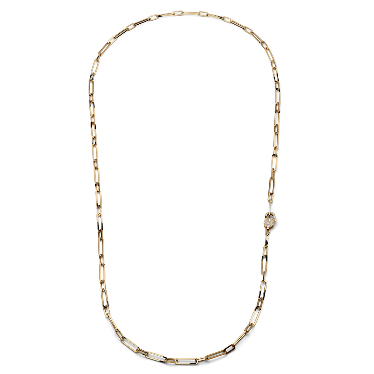 Collana da Donna della Marca Unoaerre. Il girocollo è realizzato in Bronzo con bagno di galvanica in Oro 24 KT. Raffigura una catena ad anelli rettangolari schiacciati con lavorazione lucida. Se ami gli accessori moda dal fascino senza tempo, questa collana a catena lunga è sicuramente il gioiello fashion adatto a te. Elegante, luminosa e versatile, questa collana lunga è la scelta giusta in ogni occasione. Indossala lunga o a doppio giro, abbinala agli orecchini e al bracciale in catena coordinati per un total look unico. La lunghezza della catena è di 104 cm. La chiusura è con maglia a moschettone impreziosita da zirconi bianchi incastonati.