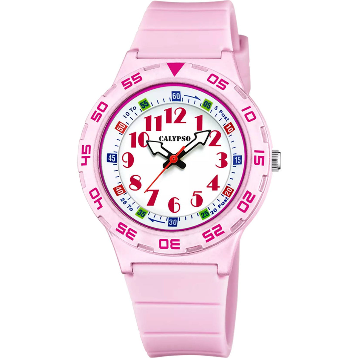 Orologio da Bambino della marca Calypso, movimento al quarzo solo tempo. Cinturino in gomma misura 31 mm regolabile. Il quadrante è bianco, la ghiera è in resina rosa.. Il vetro è minerale. La resistenza all'acqua è 10 ATM.