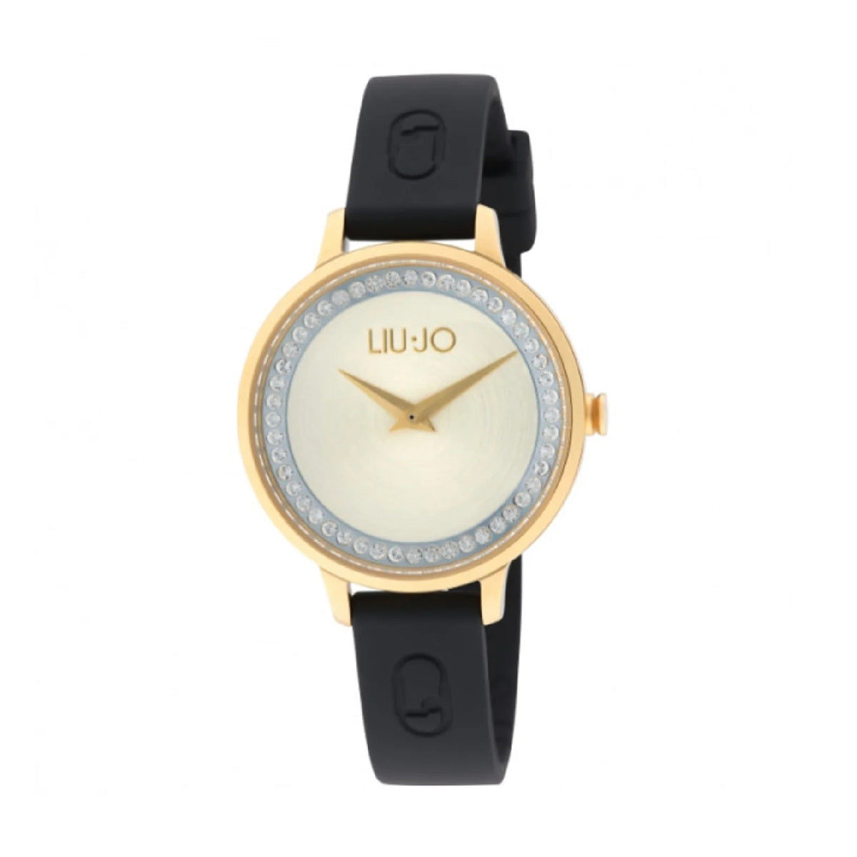 Orologio Solo Tempo Da Donna Di Liu Jo Della Collezione Shine. L'orologio è realizzato con cassa in acciaio rotonda color oro con diametro di 32 mm. Il quadrante è di colore oro con zirconi bianchi incastonati come indici. Il vetro è minerale e la resistenza all'acqua è di 3 ATM. Il cinturino è gomma nera in silicone con fibbia in chiusura