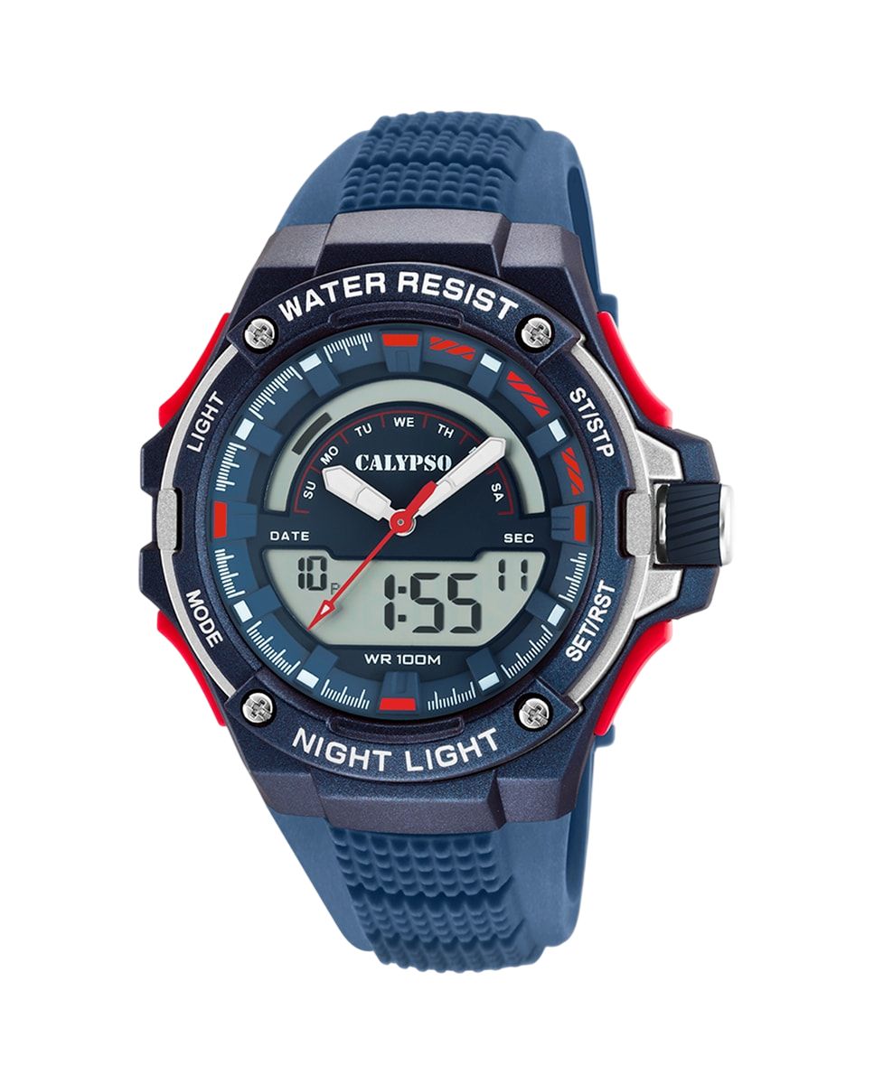 Orologio da Uomo adatto anche da Bambino della marca Calypso, movimento al quarzo con lettura analogica e del display digitale e caratteristiche del cronografo, allarme, sveglia e timer. Cassa in resina blu con lavorazione satinata misura 45 mm. Il quadrante intorno è blu con scritte delle sue caratteristiche, la ghiera è di colore blu. Il cinturino è in gomma nera. Il vetro è minerale. La resistenza all'acqua è 10 ATM.